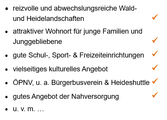 Mit diesem Profil hat Neuenkirchen mit den Ortschaften sehr gute Voraussetzungen, sich zu einer attraktiven Gemeinde mit lebhaften Einrichtungen sowie vielfältigen Freizeitmöglichkeiten weiterzuentwickeln und die für Jung und Alt bedeuten kann: hier lebe ich gern, hier ist meine Heimat.